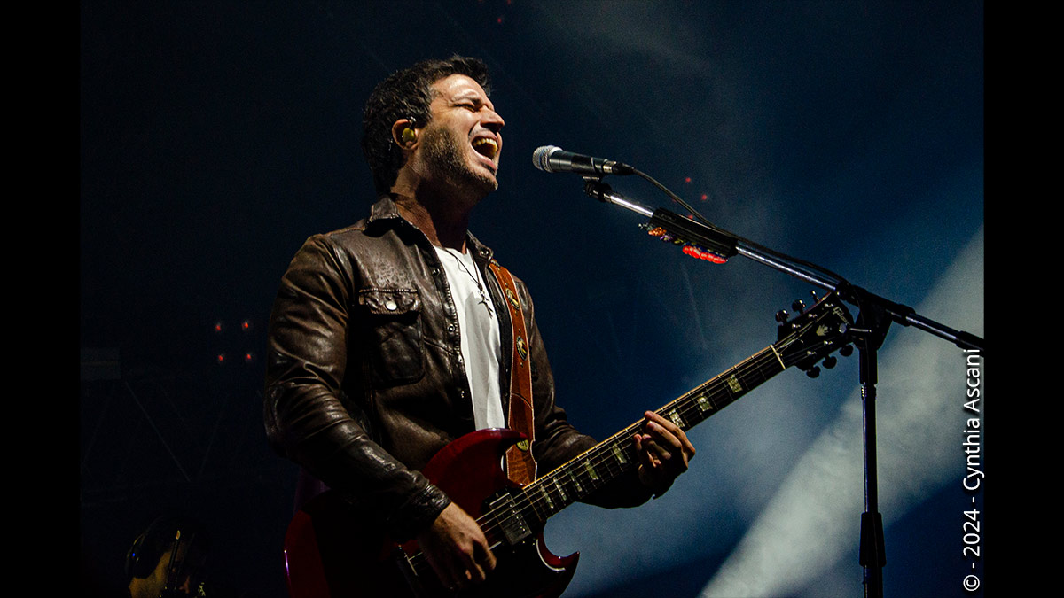 Primer intervalo de la noche: los músicos bajaron y salió un video en la pantalla, recorriendo los 25 años de carrera de “El Bordo” con fotos de shows pasados y momentos de los músicos juntos desde chicos. La pausa finaliza con Ale Kurz en la tribuna frente al escenario, solo con guitarra en mano, para tocar “Volviendo al sol”, mientras trapos enormes cruzaban por encima de la gente en el sector del campo y el público acompañó con las luces de los teléfonos.
